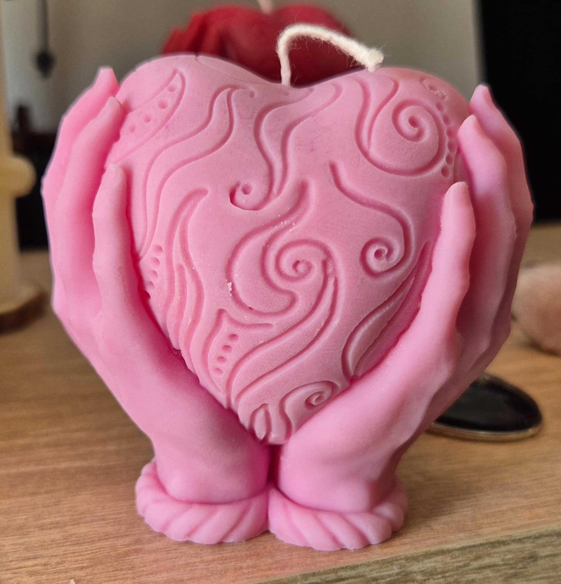 Χειροποίητο κερί σόγιας σε σχήμα καρδιάς, τρυφερά αγκαλιασμένη από χέρια. Με ροζ απόχρωση και ανάγλυφα σχέδια που θυμίζουν ενεργειακές ροές, το κερί αυτό ενσαρκώνει την πράξη της αγάπης: το να προσφέρεις την καρδιά σου.