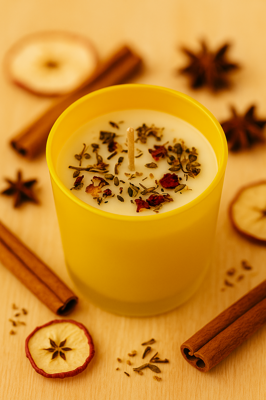 Ανακάλυψε την αρμονία της φύσης μέσα από αυτό το χειροποίητο κερί με βότανα. Κατασκευασμένο με φυσικό κερί σόγιας, τοποθετημένο σε κομψό κίτρινο γυάλινο ποτήρι, προσφέρει όχι μόνο άρωμα αλλά και ενεργειακή εξισορρόπηση. Η επιφάνειά του είναι διακοσμημένη με αποξηραμένα βότανα, όπως ροδοπέταλα, λεβάντα και φύλλα, που ενισχύουν την αίσθηση γείωσης, καθαρότητας και ηρεμίας.
