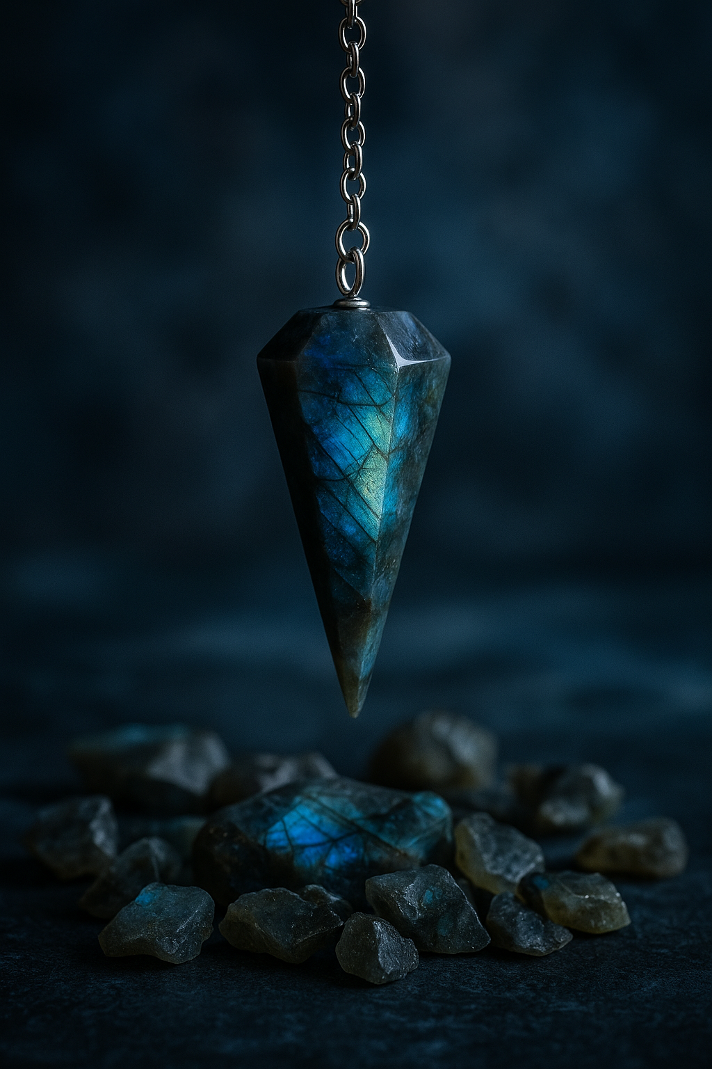 Το εκκρεμές από Λαβραδορίτη ακτινοβολεί μυστήριο, προστασία και φως από άλλες διαστάσεις. Γνωστός ως ο λίθος της μαγείας, ο Λαβραδορίτης ενισχύει τη διαίσθηση, την ψυχική όραση και την εσωτερική σοφία. Οι ιριδισμοί του σε αποχρώσεις μπλε, γκρι και πράσινου αντανακλούν το φως της συνείδησης και καθοδηγούν με ακρίβεια σε ενεργειακές ή ψυχικές εργασίες.